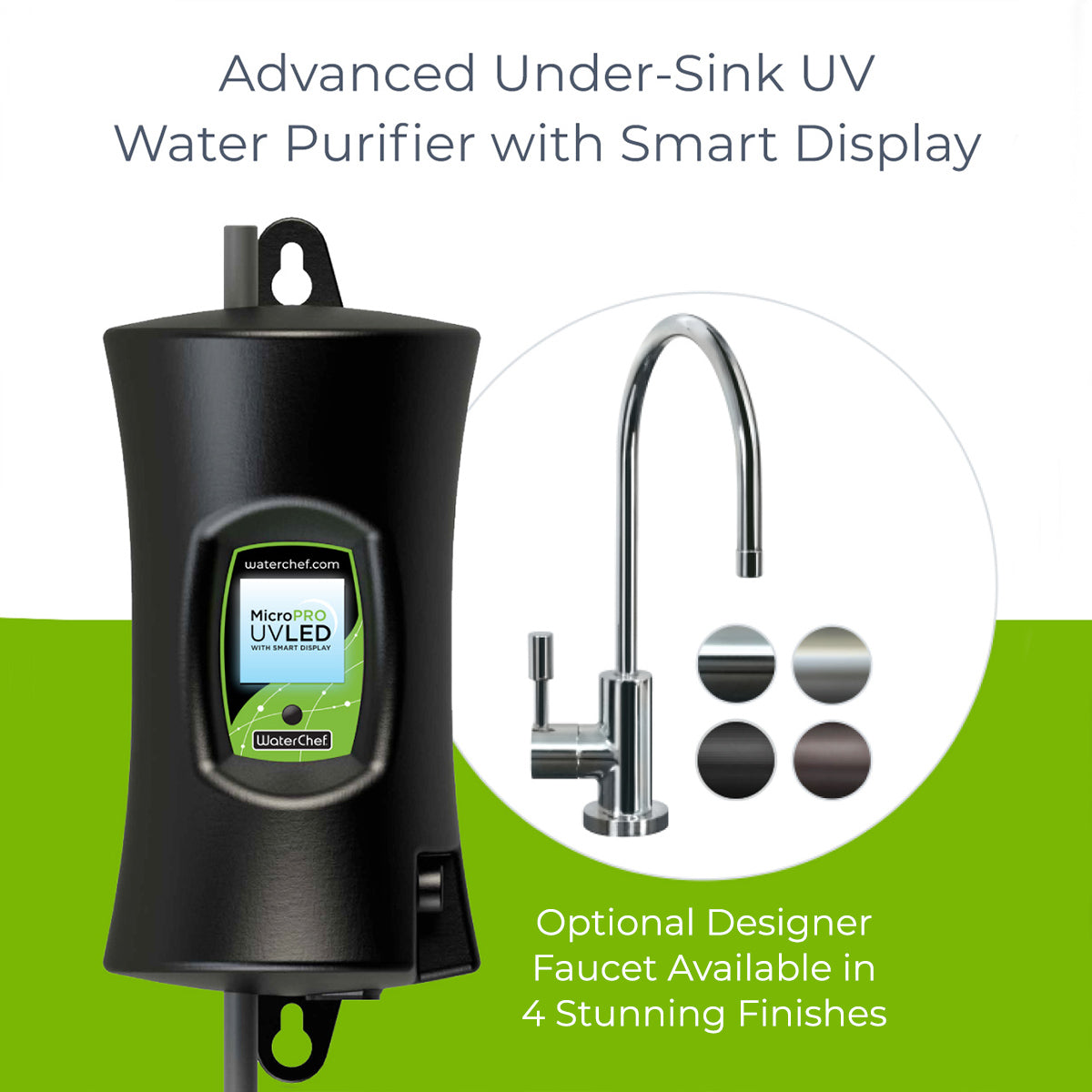 Seamless Integration: MicroPRO's Versatile Design Enhances Your Space – The MicroPRO is designed for seamless integration into any kitchen decor, offering compatibility with existing dedicated cold water faucets or WaterChef's premium-grade designer series faucets, available in four beautiful finishes. This versatility ensures that your water purification system not only performs flawlessly but also enhances the aesthetic appeal of your space.